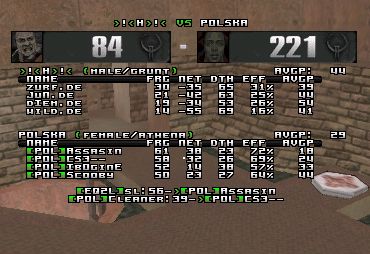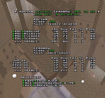 Well, think the Germans by now realized where this was heading. After a short wait where we did some kicking of random spectators to free spots for the german players, the game got started. I have said it before, and I'll say it again: Poland is one great teamplay machine. On this map more than most shows that, how they distribute ammo/weapons around to map, how they hold positions, they got it nailed down 100%. Well, at least so good that GER never really stood a chance. Cs3 did a mans job on this map, standing in for Cleaner. At the start he had a impressive run with the SG and 5 health, were he got quite a few frags before Assasin took him down close up with hyper. Speaking of Assasin, he surely has an impressive close up aim with any weapon. Especially how he whored the hyper close up was impressive. The key is still how they held the RA, and not only held it, but they managed to get the RA stacked players out on the field making some frags. One thing is holding an area, another thing is to convert the area control into frags all over the map. Again, GER players did what they could, but they never had much of either health or weapons. Ibo again, the smoothest mover in the fray, seemed to be having fun up by RL, forcing his enemy (dIem) to jump into the slime. Some funny moments up there. Else, blaster blaster blaser. Gotta give GER credit for never giving up. But, Poland is just too strong now.