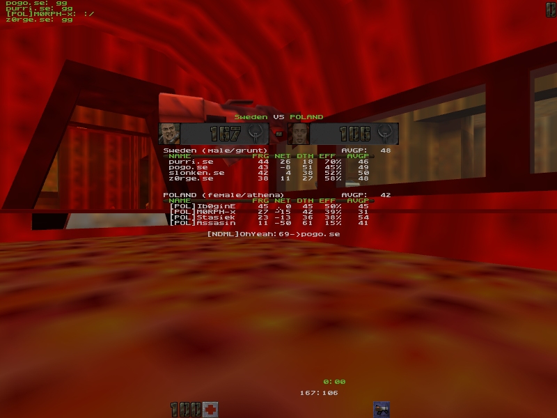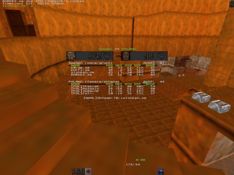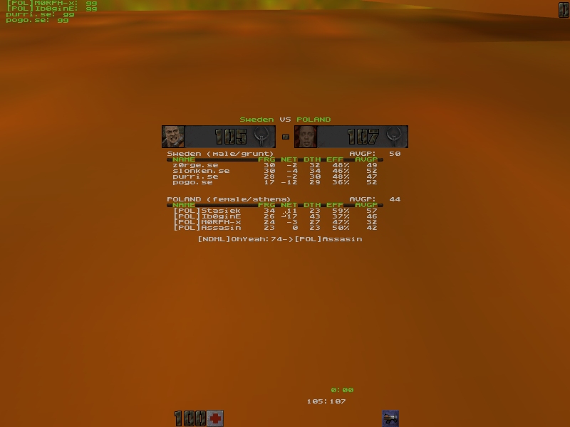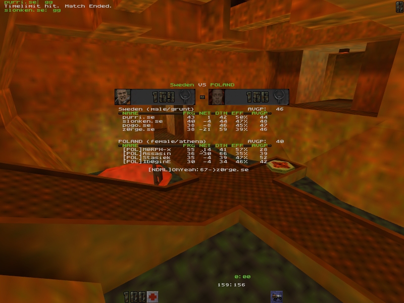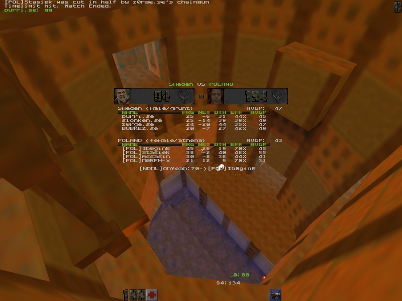 Map starts out badly for SWE, again. Assassin makes a fantastic start and after 1 minute SWE is behind 3:10. Soon both team get their game going and so begins another very even game. POL was leading most of the time, but when 16 minutes was played - a tie 81:81! The final minutes were VERY nerve-wrecking. One minute before the end POL leads 95:102, then SWE appears out of nowhere 30sec before the end and frags POL like there's no tomorrow. In the end I think Assassin was surrounded by 3 swedish guys, but SWE just ran out of time. =) And Assassin was the only player with efficiency over 50%.