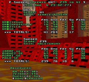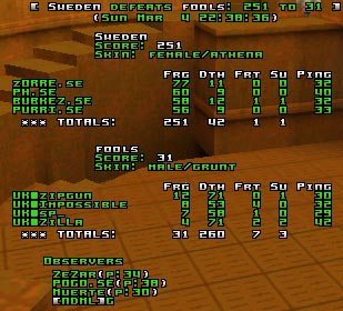 I was called by purri to admin this game and they had already picked the server and the maps so it was an easy task for me and I jumped in. Q2DM1 - Sweden's mapIt took only 1 minute to Sweden to completely lock the map and transform this game into a good old rape. PURRI denied the rail to the British during the whole game and placed a couple of crazy flick rails of his own secret. During this time ph and zORRE were being real frag machines sniping the poor UK guys from the Mega Room entrance. Both of them were amazing to watch with some very high rail accuracies. Bubkez was, of course, at lift and enjoyed himself there for the whole game. Sweden never lost their focus and kept the map locked all the time. The UK guys tried to frag the best they could but they weren't coordinated enough and whenever they attacked a Swede, they were killed by another one. Q2DM3 - UK's mapPogo replaced ph for Sweden and the game started with a huge advantage for Sweden here also. Bubkez took the first Invul and killed the UK quadrunner before he even could score a frag (as far as I can remember), PURRI quickly secured the rail and displayed some robotic reflex railfrags which litterally hammered the UK guys. zORRE took something like 99% of the quads with the help of Pogo. Bubkez killed the UK people who tried to get a RL and took most of the Invul. From the UK side, zilla zipgun and Impossible all tried to get some frags here and there. Zilla took one invul and score a couple of frags while Impossible managed to break the Swedes' control over both the SSG and the Rail. Zipgun did a couple of funny frags taking the Swedes by surprise. sp_ kinda gave up the game after a moment though. ConclusionImpressive gaming by Sweden while UK proved once again that what they lack the most is teamplay and coordination.