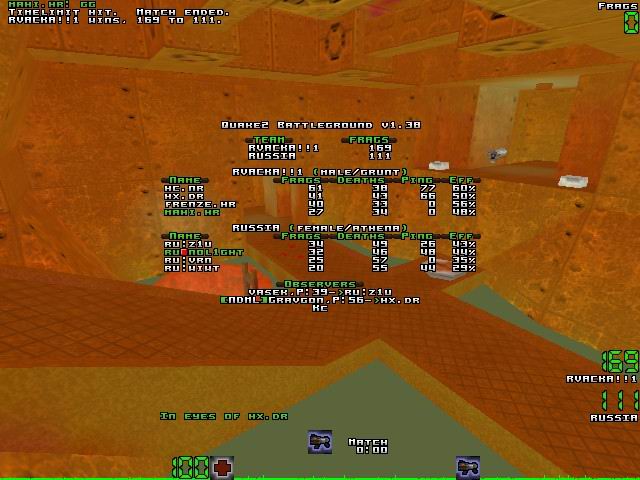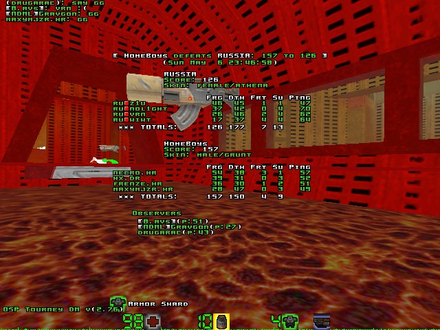 The game was closer at RA, the Russians were attacking it with 3 and the couple necro/frenzy were outnumbered (yes because 3 > 2, I'm good at math!). The only problem for the Russians is that Necro often tooled up at maxy's RL shop while Frenzy went berserk with any weapon he could find. So when 5 minutes were remaining, the 20 frag gap increased again in favour of Croatia until the end.