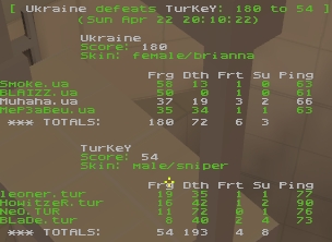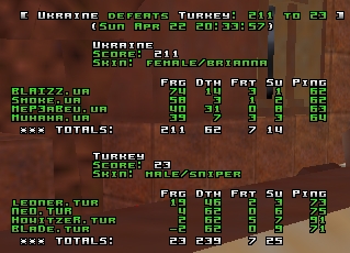 Both captains were looking for eachothers in the IRC channel a while before the game started, and when they finally found eachothers they created a channel and found a server. I came too late (sorry) to be able to join the server as it was full, but judging by the screens it seemed like it was a deserved win for  Ukraine, who were big favorites coming into this game. Good to see a fairly even server were found as well, as  Turkey players suffer from horrid connections! Good games, watched the last few minutes on q2dm6 but not enough to type out a very detailed report :( Q2DM2 :: Turkey's map Q2DM6 :: Ukriane's map :: Demos ::