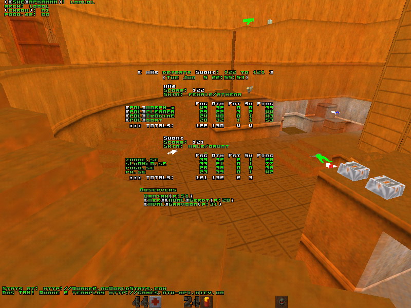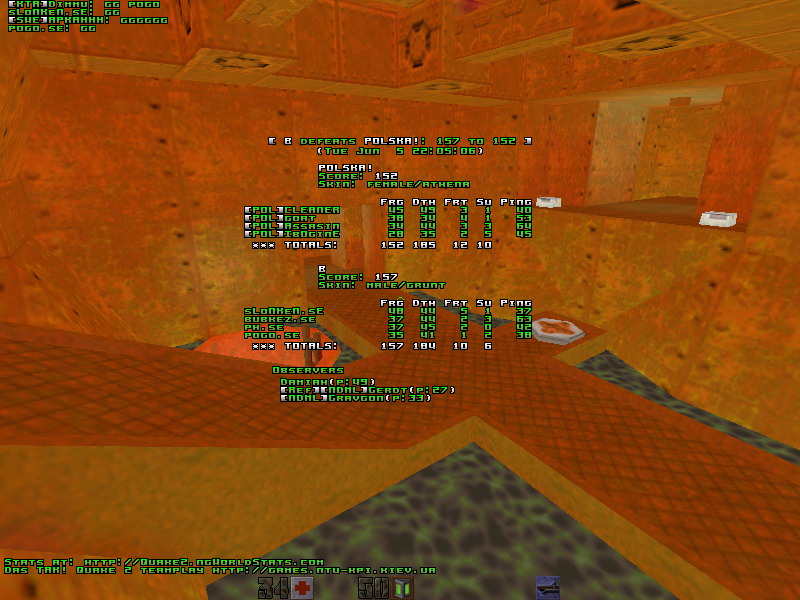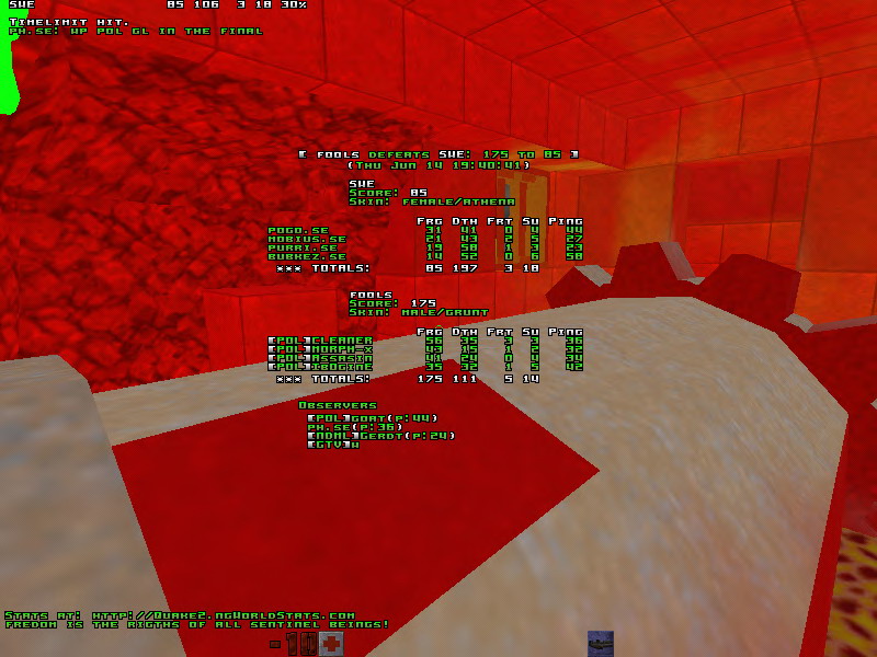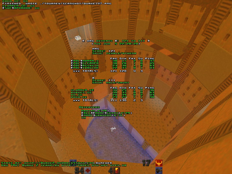 To be continued...For those who wants to know what's happening: The score is currently 2-1 in favour of Poland (Poland won dm2 and dm1, Sweden won dm7). Then they played the third map, q2dm6, 17 seconds remained before the end of the map and Poland was leading by 3 frags, Sweden just took the Quad, then the server was shut down by the system admin. In consequence, that map has to be replayed from start (it's the best solution for both teams). That map (and the 5th map is needed) will probably be played on the same day as the final against Finland, the winning team will have to be ready to play vs. Finland directly after. The date of the end of that semifinal game + the final game will be announced when they agreed on a date. ŠGravgon Demos:
