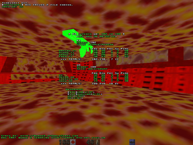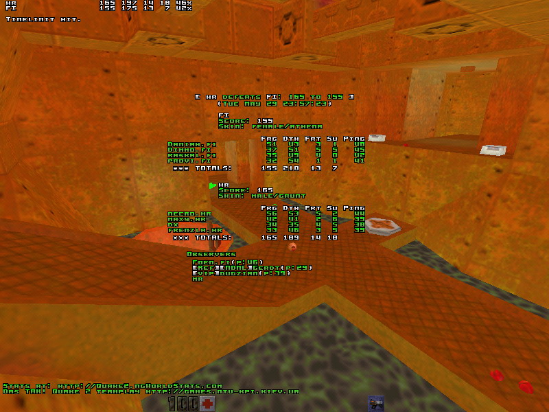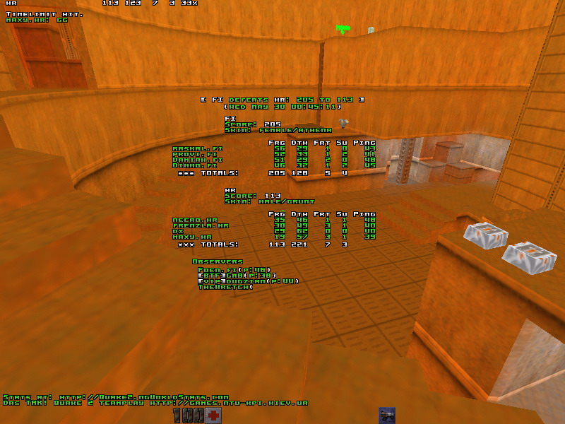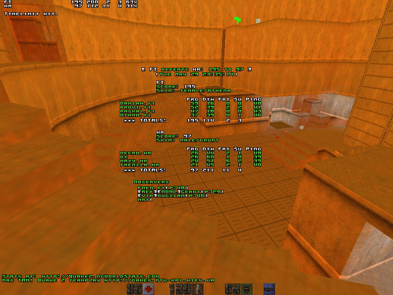When Croatia couldn't field four players at the scheduled time (19cet) Finland agreed to wait untill they would. It all ended out in more then 4 hours waiting, but finally the game started. :: First map: q2dm1 (Finland's choice) ::The game was even for the first ten minutes. Both teams couldn't really control any area and played FFA most of the time. After those close ten minutes the Fins started the classic railrape. At a point all of their players had a railgun (thanks to raskal) and started to make a huge amount of frags. Damiah took up his usual route from the arena to the megaroom, hitting a lot of rails and trying to avoid deaths. provi did the harder work and tried to keep the room safe. The Croatians didn't hesitate a second to attack it via the lift, where Dimmo had a hard time. Once again the railgun was the key to the win on this map. The Fins played the game very 2007: lots of slugs and very good aims. Man of the map: DamiahDemos: :: Second map: q2dm7 (Croatia's choice) ::Croatia's dm1 tactic - attack/die/attack/die/attack/die - worked out a lot better on this map. Finland got the best start with RA and some lucky spawns. Immediately the Croatians started attacking all the positions with any weapon they could find. This resulted in a lot of deaths on their side, but also in some nice blaster frags. Their tactic wasn't very conventional: once they captured an armor they went fraghunting. The leading man was necro. He looked like he was on speed and never stopped pushing his +attack and +forward button. There was never a moment of rest for the Fins who tried to get a hold of the map but got kicked out of their areas time after time. Damiah was the only Fin who could keep a positive score throughout the game, by playing defensively and sneaky. The Croatians showed some awesome timing skills and played very solid as a team. Their endurance was the key to this mapwin. Man of the map: NecroDemos: :: Third map: q2dm3 (Finland's choice) ::The good spawns were Finlands' and they got both the invulnerability and the quad. After some minutes they already had a lead. Croatia now tried to get a grip on the map and managed to take over rail. Provi was blocked by dx and couldn't start his usual thingie, in other words: " provi.fi was railed by dx". At the quad Damiah was the man to spectate. His played very smart, took a lot of quads and showed a nice ssg aim. Foen was playing the hardest position: ssg. He had his hands full with necro who played very agressively again. Most of the quads still went to Finland and they finally managed to clear rail and gave provi the opportunity to get on track. So he did and Finland locked down the map. At that point the game was over. The Croatians put some more pressure on the ssg area, but never controlled it for long. All the pents (unless i missed one) and most of the quads went to Finland. Eventhough the Croatians were a threat in all the areas and eventhough they fragged a lot Finland's lead kept growing. In short: maxy.hr tripped on his own grenade. maxy.hr was blown away by Dimmo.fi's super shotgun maxy.hr does a back flip into the lava. maxy.hr: fag pipe >(Man of the map: DamiahDemos: :: Last map: q2dm1 (Croatia's choice) ::On this last map we saw more or less the same scenario as on the first. A close game in the first half which ended out in a railrape in the second half. Indeed, raskal did an awesome job at rail and provided everyone with slugs. Croatia did their best to keep attacking but just couldn't fight up against the Finish aims. Man of the map: raskalDemos: Congrats to Finland who showed a very sportive attitude and waited a few hours untill Croatia had 4 players. Good luck in the bronze and gold finals!